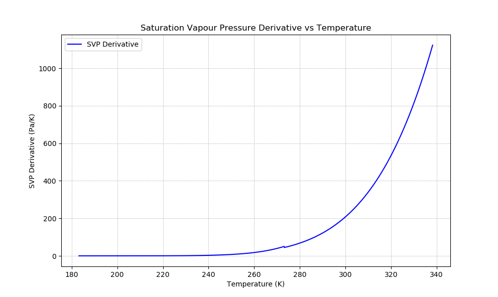 The resulting table of SVP derivative values has been plotted against the input temperature values in the figure below. Here we can see a positive rate of change of the SVP with respect to temperature, which is expected, as the SVP increases with increasing temperature. We can also see a kink in the line around 273.16 K, which is the triple point of water where the three phases (solid, liquid, and gas) coexist. This kink is caused by different equations being used for the SVP below and above this temperature.