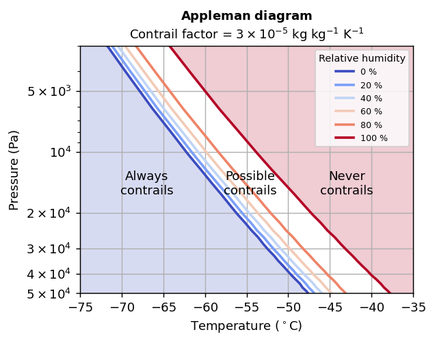 The range of atmospheric conditions under which condensation trails may form are summarised by an Appleman diagram: